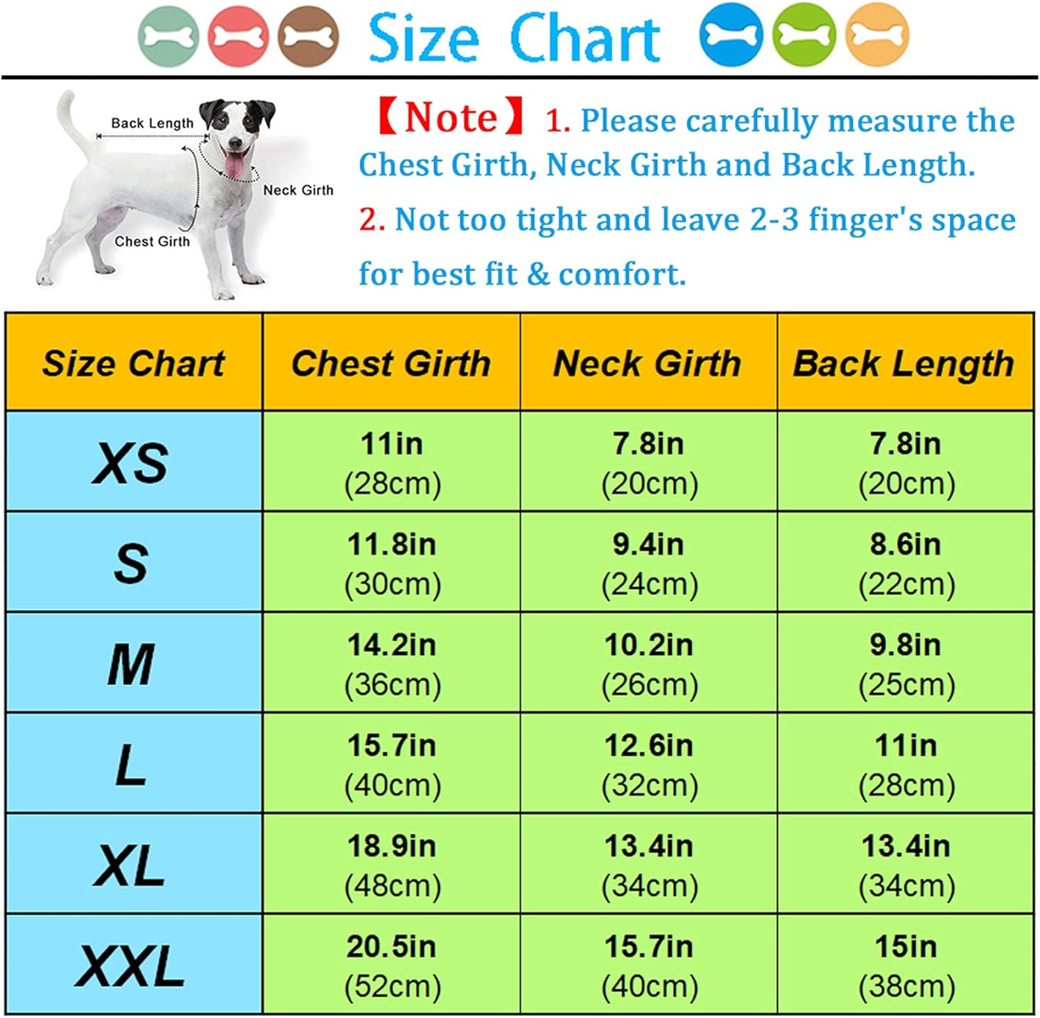 - XXL: Chest Girth: 20.5”/52cm, Neck Girth: 15.7”/40cm, Back Length: 15”/38cm