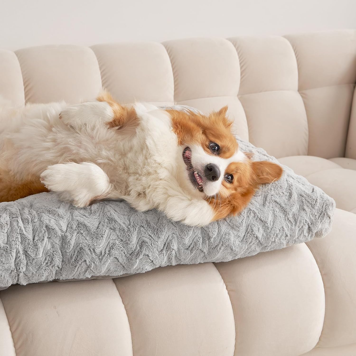 Reversible Design for Year-Round Comfort: Features 3D soft faux fur (winter & autumn) and breathable linen-like fabric (spring & summer), with distinct textures for year-round use. The winter-autumn side is ultra-soft, comfortable, non-shedding—soothing dogs, easing anxiety, improving sleep. The spring-summer side is cool, breathable, non-lint-sticking, solving faux fur’s stuffiness.