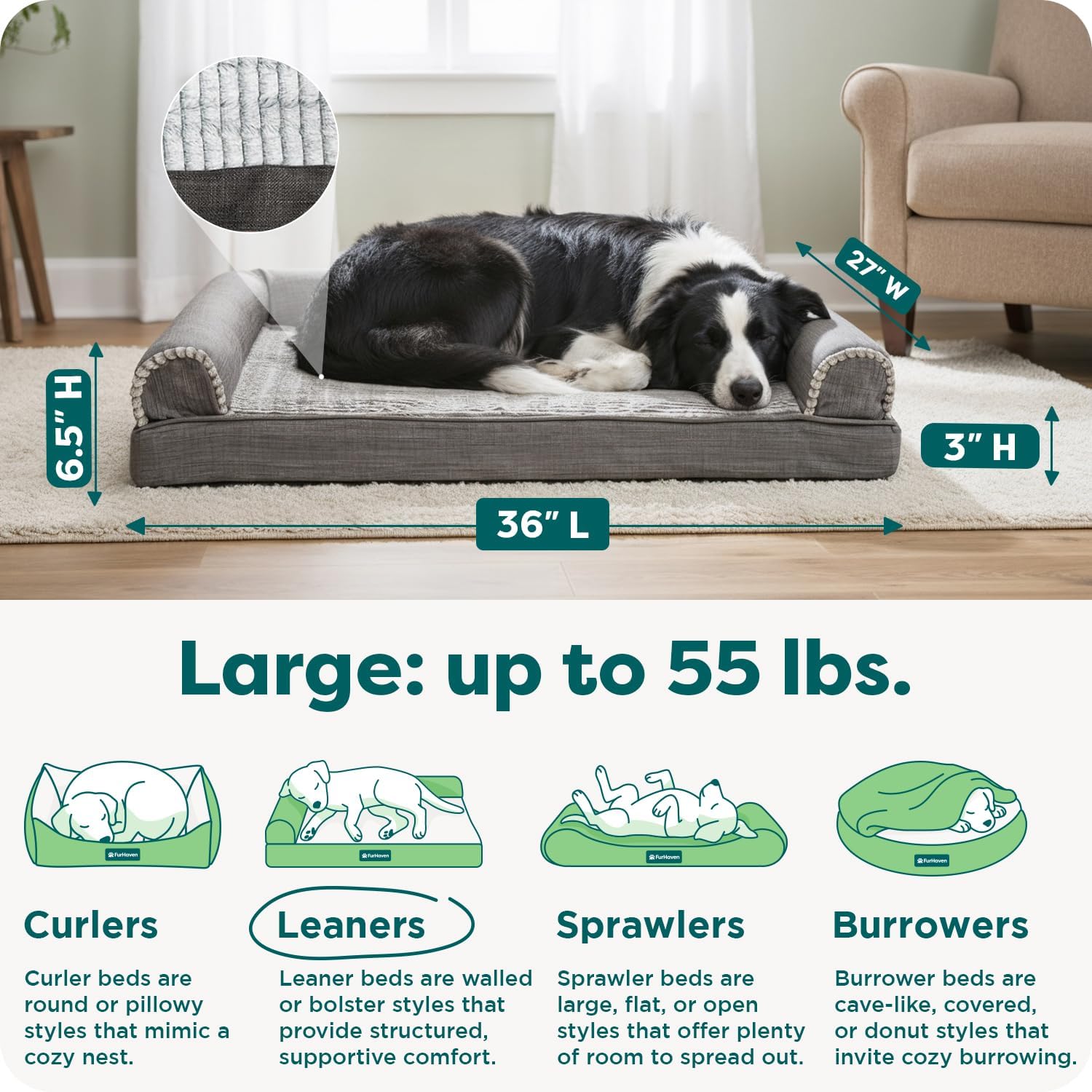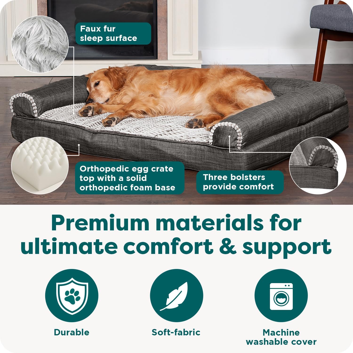 SLEEP SURFACE: Featuring a cuddly soft embossed faux fur main sleep surface and bolsters wrapped in durable woven linen upholstery fabric; both are gentle on noses and paws for enhanced snuggling and burrowing comfort