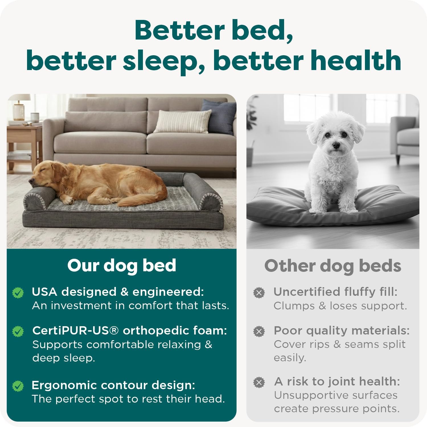 You want the best for your best friend, but finding a quality dog bed that provides real, long-lasting support is a challenge. Many beds flatten quickly or use subpar materials, leaving your pet on an uncomfortable surface that does more harm than good. FurHaven offers a better solution. The Sofa-Style Orthopedic Dog Bed is built with an orthopedic egg crate and a solid orthopedic foam base that actively supports joints and cushions pressure points night after night. We designed the sleep surface with soft faux fur for a calming feel and shaped the bed to create a bolster dog bed that provides a secure place for your pet to rest their head. Frequently Asked Questions Is it easy to clean and will it fit my dog? Yes. This dog bed with removable cover is 100% machine washable for simple, stress-free cleaning. With a full range of sizes available, our sizing guide will help you find the perfect fit. How do I know this bed will last? We built it for daily life. Our beds feature high-density, CertiPUR-US certified foam that won’t flatten, a durable non-slip base, and reinforced stitching. It’s an investment in comfort that is engineered to endure. Why should I choose FurHaven? Because we believe pets are family. Your purchase is protected by a 90-Day Limited Coverage against material defects, with 60-Day Worry Free Guarantee. We promise proven support, pet-safe materials, and an easy-care design that simplifies your life.