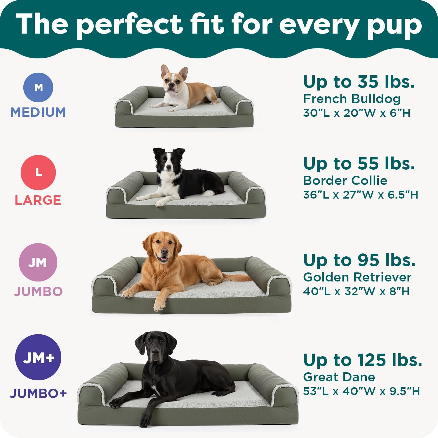 Please see the sofa bed and deluxe mattress sizing chart below for an idea of what dog breeds fit best in which beds. Each product page will have a sizing chart or bed dimensions to help you determine the appropriate size. Please keep in mind that this is just to give you an estimate based on average height and weight of said breeds. It also depends on the dog’s size and personality. If your pup likes to sprawl out when they relax we suggest going with a larger size bed. If your dog enjoys curling into a small ball while sleeping you would be fine with the current size you think would fit your pet. We always suggest sizing up if you are worried your pet won’t fit in their bed.