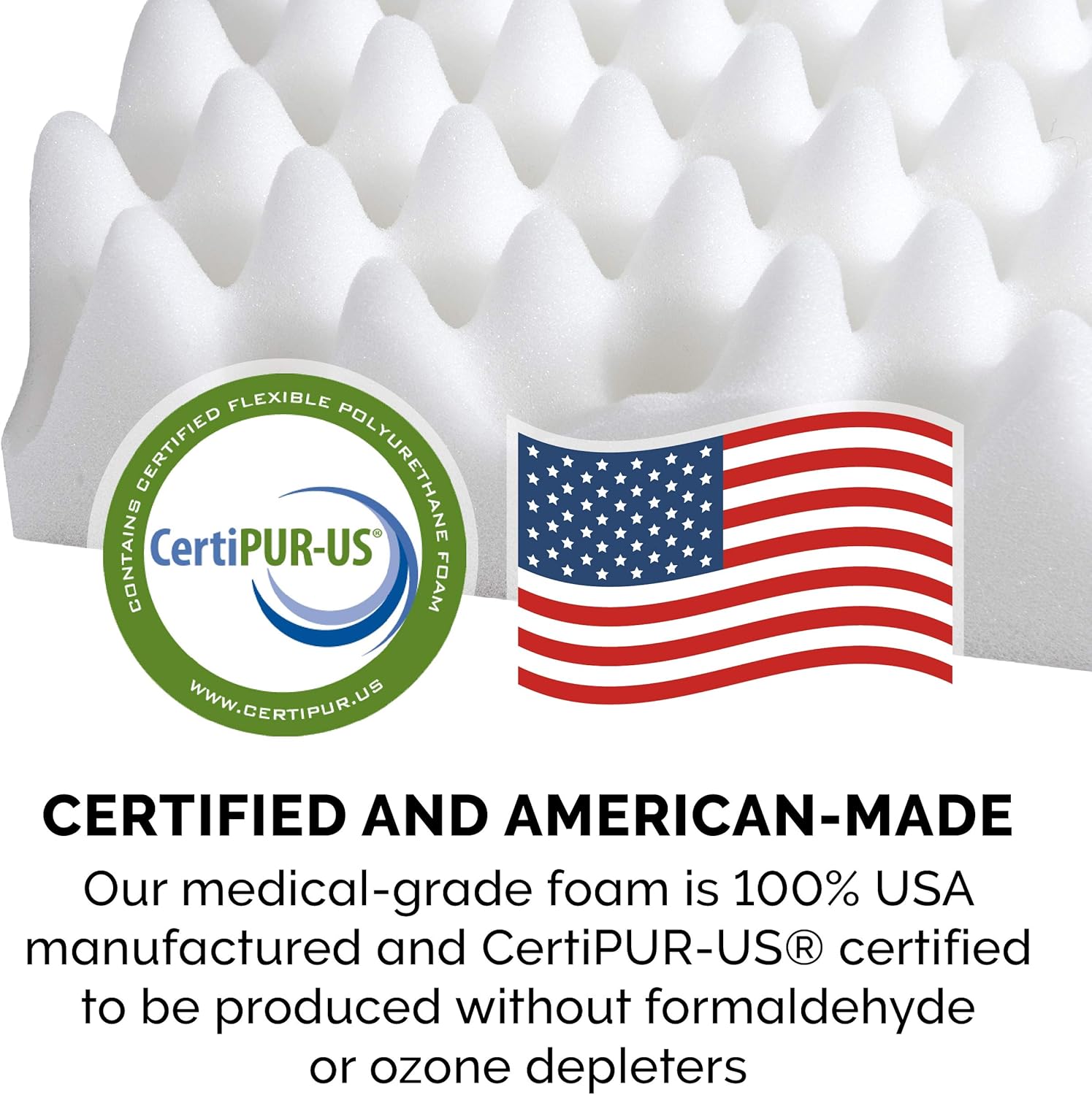 CERTIPUR-US: Our foam is 100% manufactured in the USA and independently tested to meet CertiPUR-US standards for emissions, content, and durability; made WITHOUT formaldehyde, phthalates, mercury, lead, and ozone depleters