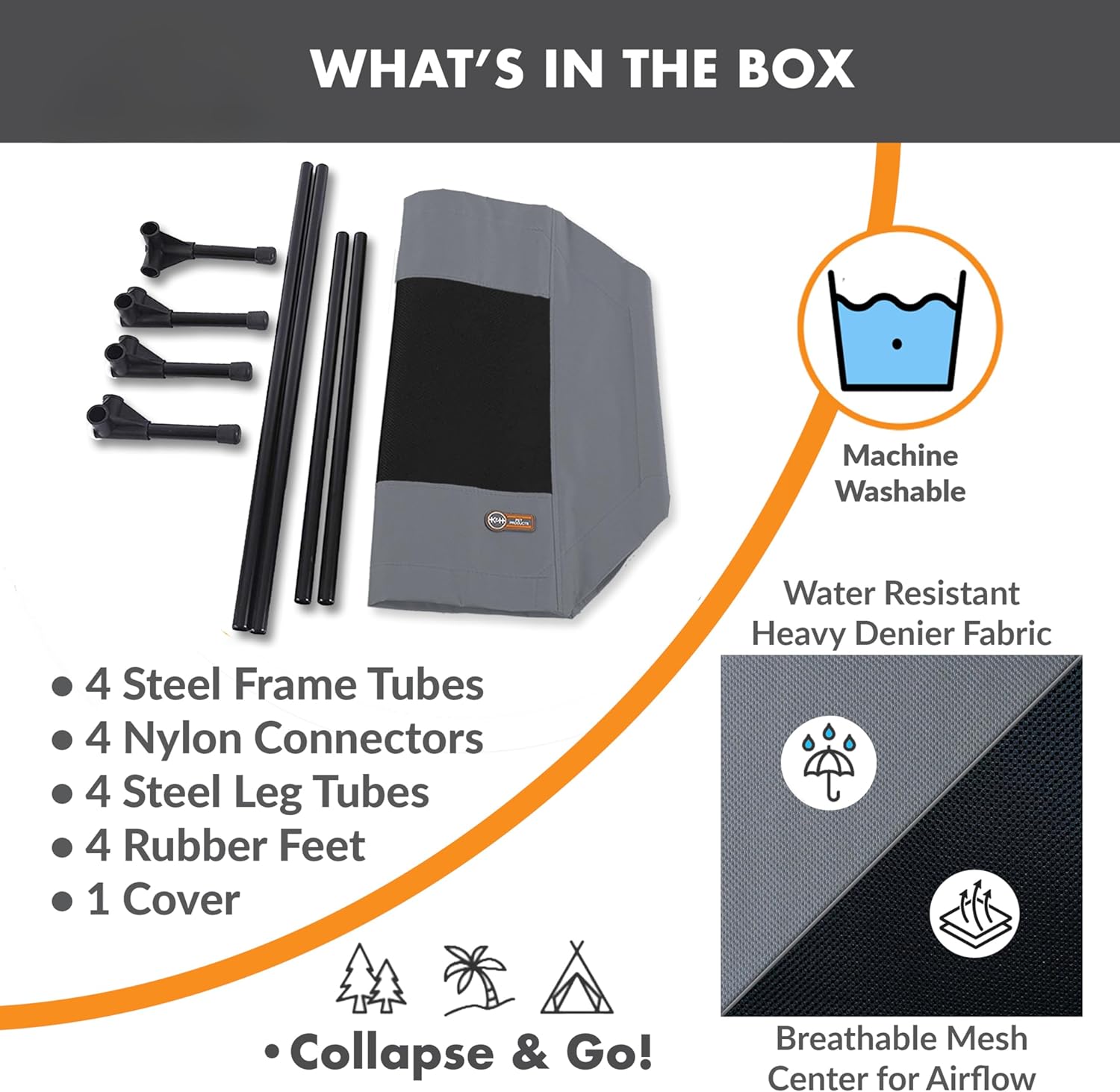 EASY TOOL-FREE ASSEMBLY: Collapsible outdoor dog cot is easy to assemble and disassemble, no tools necessary making this portable bed great for use at home or during travel, camping, picnicking, place cot for dog training and more
