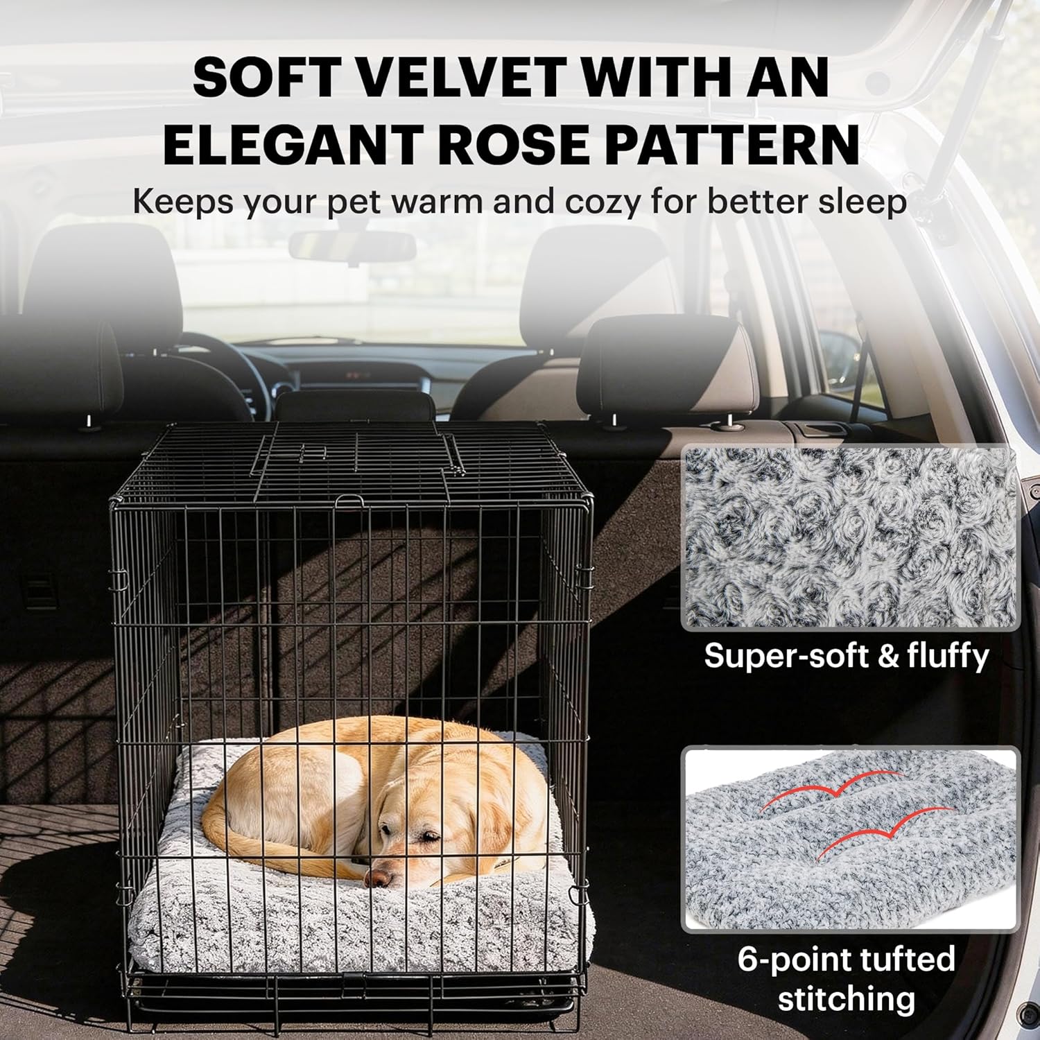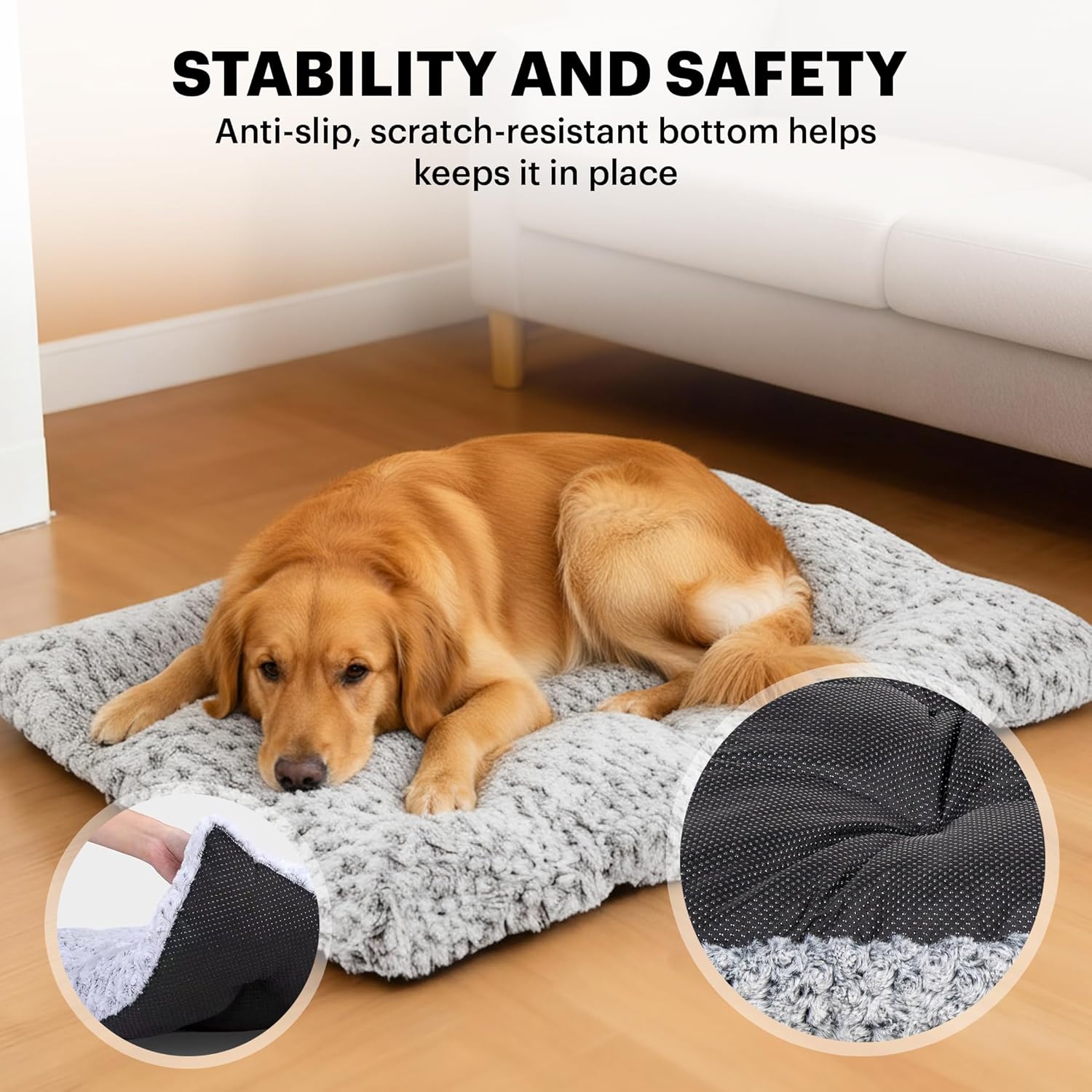Stability & Safety – Anti-slip, anti-scratch bottom keeps the crate pad firmly in place, preventing sliding when dogs jump in or out, boosting their sense of security.