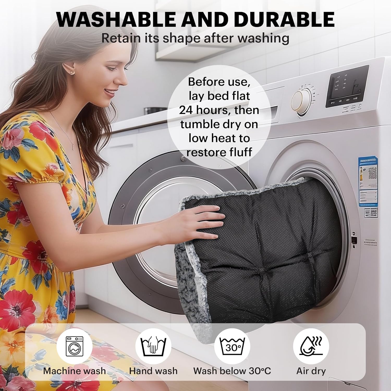 Ready to Use – Shipped vacuum-packed for protection, simply pat the bed flat and allow up to 24 – 48 hours then tumble dry low with tennis balls (for best results) or towels to retain original shape.