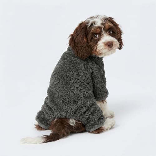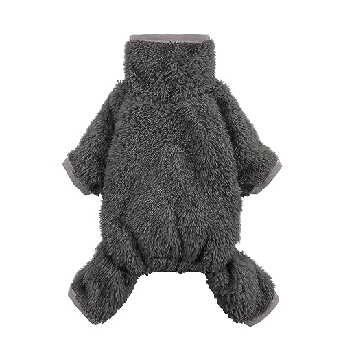 These doggy pajamas feature an athleisure design in dark grey, with a mock neck, covering the full body including the legs. This fluffy dog outfit ensures warmth, creating a cozy experience for your furry friend.