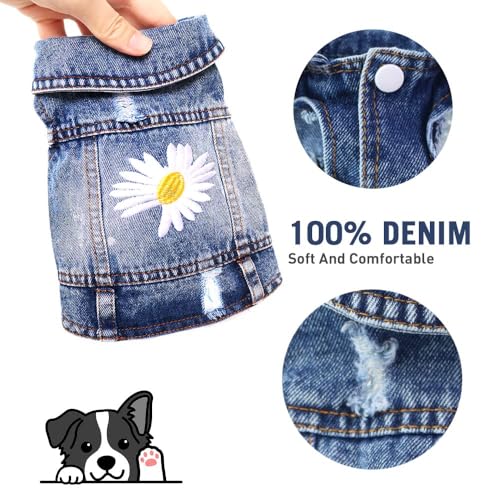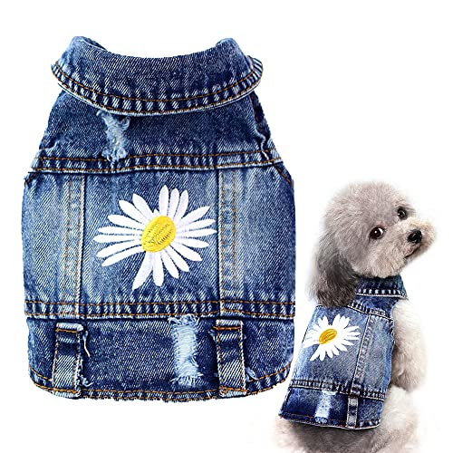 Pawstrip Dog Denim Jacket with Embroidered Daisy, Ripped Vintage Jean Vest for Small Dogs, Puppy, Pugs, Chihuahuas, Spring Summer Fall Festival Outfit, Small (Fits Chest 11-12″)