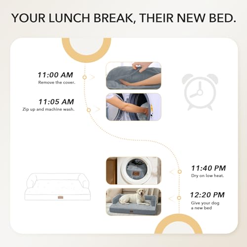 Ultimate Easy-Clean Design: The entire cover (including bolsters) is fully removable, machine washable, and dryer-safe on low heat. It significantly reduces cleaning time, making it effortless to maintain with weekly washes. Since only the cover needs cleaning, it dries quickly and can be reinstalled promptly—keeping your dog’s bed clean and ready for use. (Tip: Remember to zip up before washing.)