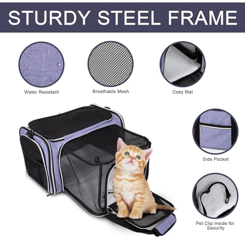 Breathability and Comfortable:The 5 sided mesh design of this pet travel bag provides plenty of breathability and visibility in any situation, allowing your pet to observe the outside world.With 3 expandable compartments, this cat carrier provides additional space on 3 sides so the pet can stand up and turn around without crouching and contortion on 3 layers removable comfy pads.