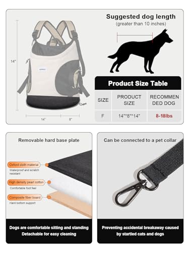 SCOPE OF USE Dog carriers for small dogs size: 14inch “(length) * 8inch” (width) * 14 inch”(height). We strongly recommend using it for dogs weighing between 8-18lbs(We strongly recommend dogs with a tail to neck length greater than 10 inche).The dog front carrier is equipped with adjustable shoulder straps, which adjust the bag to a comfortable position,does not affect walking or riding. The unique X-shaped design of the shoulder straps is more stable and comfortable than ordinary dog carriers.
