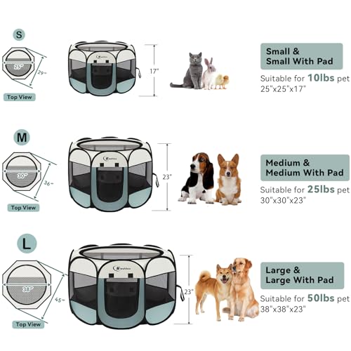 【No Assembly required】Opening the dog pen takes only a few seconds, is lightweight, strong, and does not require assembly. When not in use, it can be folded into the tote bag provided by us, which takes up minimal space and is easy to carry and store. Spacious interior Spaces allow your pet to play, sleep, hide or isolate. Perfect for indoors, lawns, beaches, parks, Tours, camping and more!