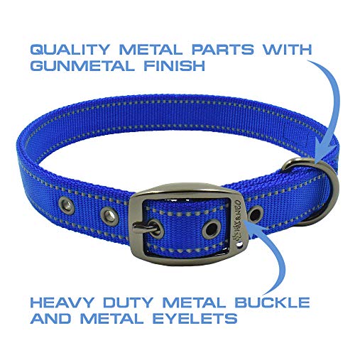 QUALITY CONSTRUCTION: Our metal buckle dog collar is 1″ wide (3/4″ small size) and made with a double nylon layer making it 4mm thick (medium and large sizes). We use a heavy duty buckle and put metal eyelets in each hole to reinforce the collar. All the metal has been anodized into a beautiful gunmetal finish. The collar has reflective stitching all around to make it more visible at night. We’ve also added an extra tab for easy attachment of dog tags and charms.