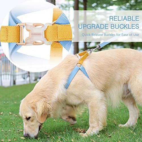 NO PULL AND CHOKE-FREE: The triangular structure of hooks and quick release buckle distributes the pull of the rope to the left and right, and wided-style design disperses the pressure through shoulders and chest, uniform force, no need to worry about the danger of suffocation or choking, which making it easier to control your dog while he does something adventurous.In addition, assisting the dog into the vehicle is also convenient.