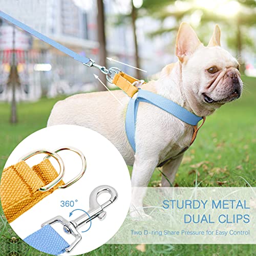 MATERIAL: Unlike other dog harness made of cheap polyester fabric, our lightweight pet harness made of thicked high density pure cotton, which make it has anti-twist and breathable construction while still maintaining quality and durability, keep your dog cool with less coverage than many other vest harnesses, perfect for walks in hot summer. All the metal accessories are highly resistant to wear and rust.
