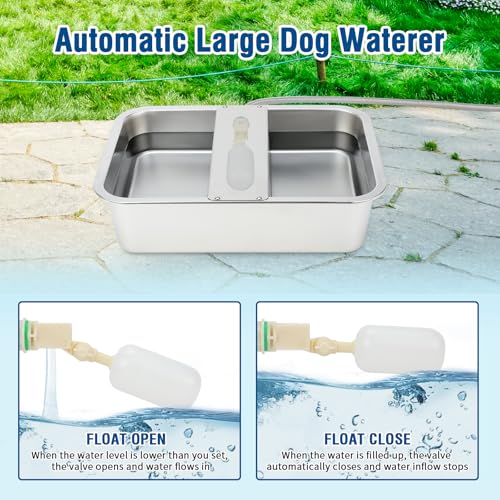 Always Fresh Water: The efficient float valve inside of our outdoor dog water bowl allows clean fresh water to be continuously replenished automatically. You can control water level by rotating the knob to adjust angle of the float. When it falls below the level that you set, the automatic dog waterer will refill. Free your hands, save the trouble and time of filling water and reduce waste with a baffle protecting the float to have a longer service life