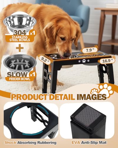 Elevated Dog Bowls for Medium Size Dogs, Non-Slip Dog Feeder with 1*Stainless Steel Dishes & 1*Slow Feeder Bowl, 5 Heights Adjustable Raised Bowls to 3.15″-8.66″-9.84″-11.02″-12.2″