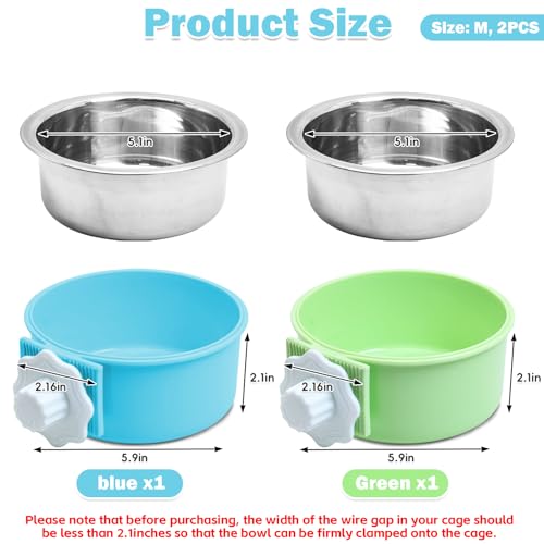 kathson Crate Dog Bowl, Removable Stainless Steel Hanging Pet Kennel Cage Bowl Food & Water Feeder Coop Cup for Puppy, Cat, Rabbit, Guinea Pigs Ferret Bird (2 PCS, Size: M, Blue and Green)