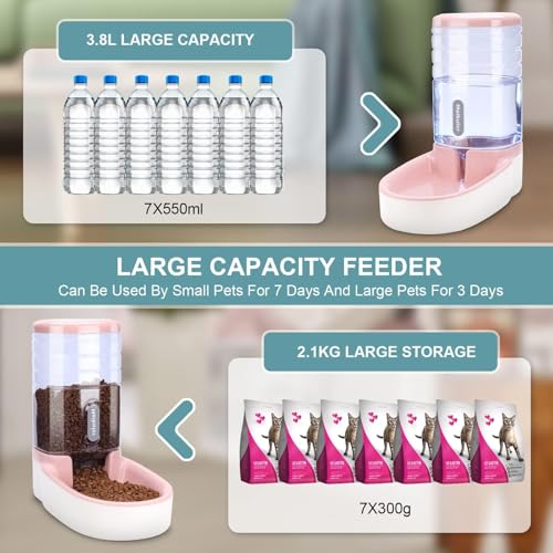 Meikuler Automatic Dog Cat Feeder and Water Dispenser Set,Waterer and Gravity Food Feeder for Small & Medium Dogs Cats Puppies,Large Capacity 1 Gallon x 2(Pink)