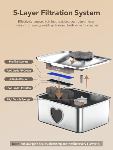 304 Stainless Steel & 5-Layer Filtration: The dog water fountain is made of food-grade 304 stainless steel, it’s non-toxic, rust-resistant, and durable for long-term use. The 5-layer filtration system effectively removes impurities, odors, and harmful substances, providing clean, safe water to protect your pets’ health.(Product Dimensions: 14.5″L x 11.5″W x 6.1″H)