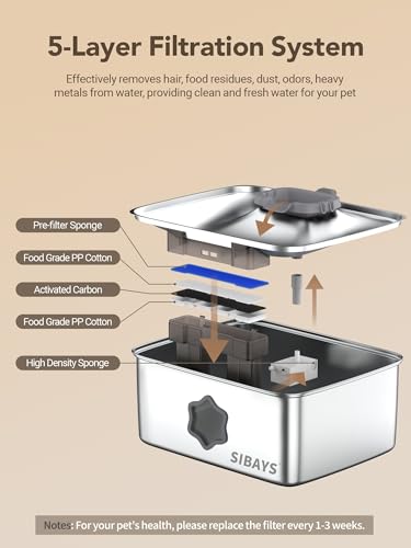 Easy to Clean: The dog water fountain for large dogs assembles and disassembles in minutes for easy maintenance. For your pet’s health, we recommend replacing the filter and sponge every 1-3 weeks. You can search “L05” in SIBAYS store, or search “B0DXPPGVTZ” on Amazon to buy the replacement filters. And search “P05” in SIBAYS store or search “B0F6D1YS8C” on Amazon to buy the replacement pump.
