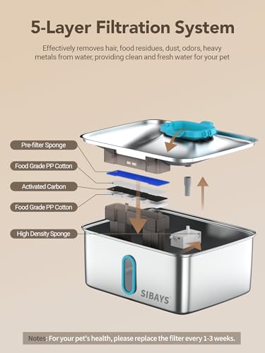Easy to Clean: The dog fountain water bowl is simple to assemble and disassemble, making cleaning a breeze. For your pet’s health, we recommend replacing the filter and sponge every 1-3 weeks. Tips: You can search “L05” in SIBAYS store or search “B0DXPPGVTZ” on Amazon to buy the replacement filters. And search “P05” in SIBAYS store or search “B0F6D1YS8C” on Amazon to buy the replacement pump.