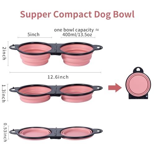 SLSON Collapsible Dog Dual Bowls Reinforced Rim 180 Degrees Flip Over Foldable Double Bowl with Lock Clips More Stable Dog Travel Bowls Pet Food Water Feeder (Light Pink)