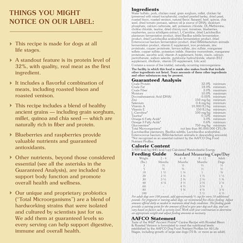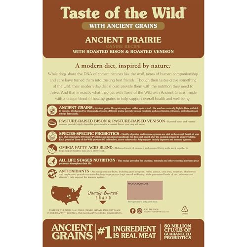 Taste of the Wild with Ancient Grains Ancient Prairie with ROASTED BISON and ROASTED VENISON dry dog food; REAL MEAT is the #1 ingredient; high-protein (32%) to help support bones, joints and LEAN, STRONG MUSCLES
