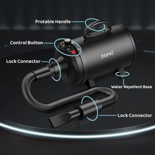 Strong Blow Force: The power of this dog hair dryer is 5.2 HP/3800 watts. The strong blow force enables the dog hair dryer to dry the thick dog hair, remove loose dog hair, dirt,and scurf, making the dog hair more smooth and shiny to achieve the beauty effect of pet grooming shop.