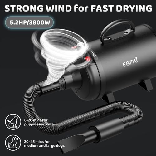 Dog-Hair-Dryer, 5.2HP/ 3800W High Velocity Pet Blow Dryer with Heater for Grooming, Speed Temperature Adjustable Dog Blower Grooming Dryer with 4 Nozzles