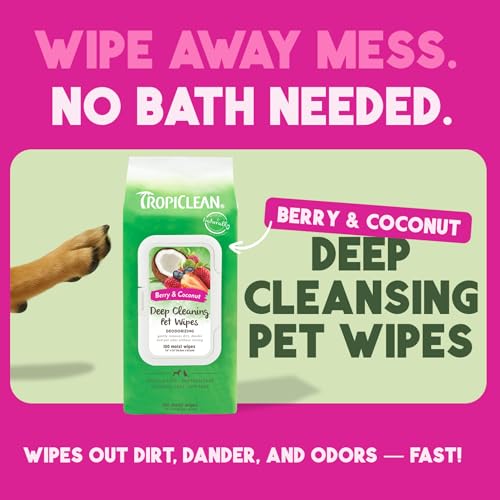 TropiClean Deep Cleaning Pet Wipes, 100ct – Wipes for Dogs & Cats – Gently Removes Dirt, Dander & Smells – for Pet Paws, Face, Body & Bottom – Sweet Berry & Coconut Scent