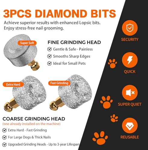 𝟑 𝐃𝐢𝐚𝐦𝐨𝐧𝐝 𝐆𝐫𝐢𝐧𝐝𝐢𝐧𝐠 𝐁𝐢𝐭𝐬 𝐟𝐨𝐫 𝐀𝐥𝐥 𝐁𝐫𝐞𝐞𝐝𝐬: Soft grinding bit gently removes sharp edges and delivers a smooth finish. Hard diamond bit provides faster grinding for large dogs and thick nails. Ideal for all breeds and sizes