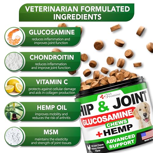 Vet Promise Hemp Hip and Joint Support Supplement for Dogs – Glucosamine for Dogs – Hemp Oil, MSM, Chondroitin – Support for Joint Pain Relief and Health – 120 Soft Chews – Made in USA