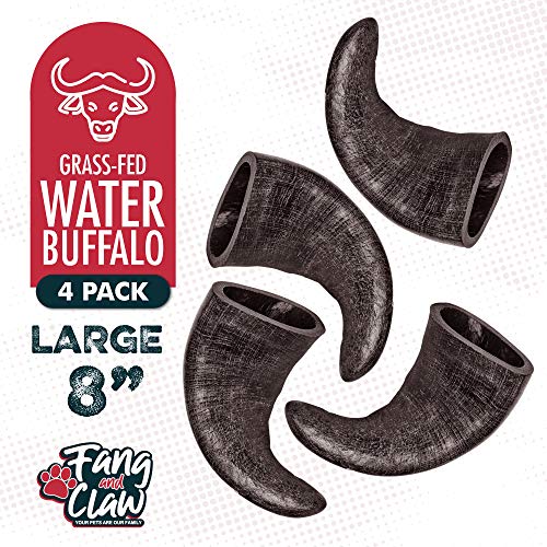 Water Buffalo Horn Dog Chew 4 Pack – Large 8″ – All Natural Free Range Grass Fed Single Source Protein – No Chemicals, Additives, Hormones – Long Lasting, Good for Aggressive Chewers – by Fang & Claw
