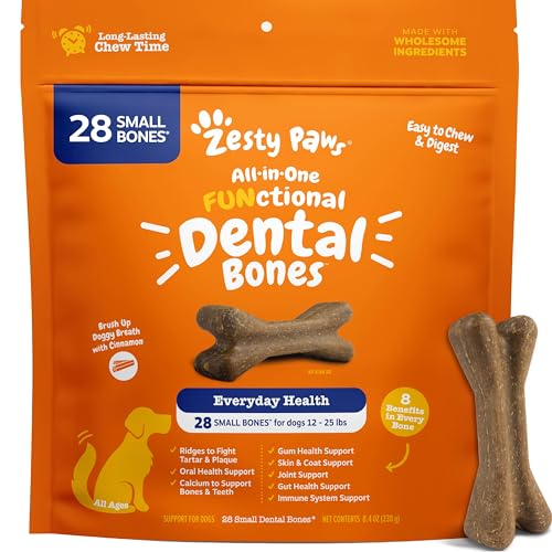 Zesty Paws Dental Bones – Fights Tartar & Plaque – Gum, Teeth & Bone Health – Cinnamon for Dog Breath – Immune, Joint, Gut, Skin & Coat Support – Omega 3 EPA & DHA and Calcium – Small Dogs – 28 ct