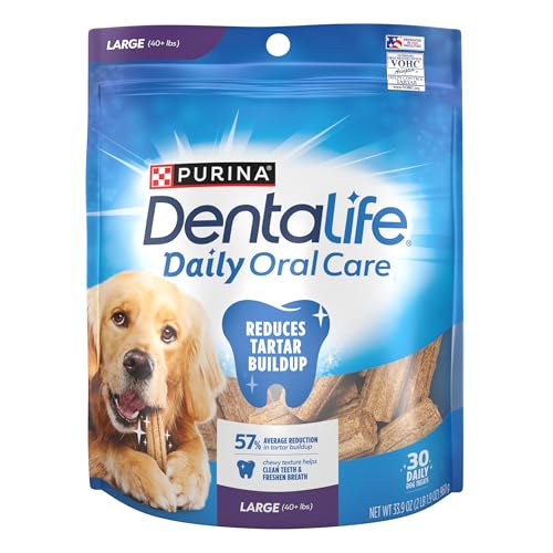 Part of caring for your dog’s health is helping him to maintain healthy teeth, and Purina DentaLife Daily Oral Care large adult dog treats help clean his teeth. The tasty chicken flavor keeps him excited about snack time, while the wholesome ingredients let you feel good about serving these treats to your dog. With a formula that’s scientifically tested to reduce tartar buildup, these VOHC (Veterinary Oral Health Council) accepted treats help to deliver a breakthrough clean that keeps your large dog’s breath fresh. The innovative design, which contains eight distinct ridges plus thousands of air pockets that produce a porous, chewy texture, cleans his teeth right down to the gumline. Featuring a large size designed with large dogs in mind, these adult dog treats are packaged in a convenient resealable pouch, helping to preserve freshness. Let him know you care about his teeth every time you reach for a pouch, and support his smile throughout a long, healthy life together.