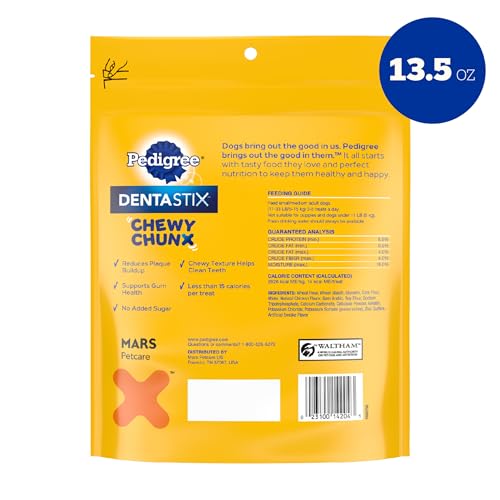 Dogs bring out the good in us. Pedigree brings out the good in them. Pedigree Dentastix Chewy Chunx Small & Medium Dog Treats Chicken Flavor are made with a delicious chicken flavor your dog will love. These oral care dog treats have a chewy texture that helps reduce plaque buildup and clean teeth. With less than 25 calories per treat, Dentastix Chewy Chunx are great for rewarding. This small and medium adult dog treat helps clean teeth and supports gum health while being made with no added sugars and low fat. Treat your dog up to 5 times a day with Pedigree Dentastix Chewy Chunx and help keep that slobbery smile you love healthy.